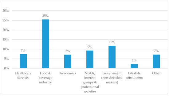 Just over one-third of all 105 identified direct relationships with decision-makers were between decision-makers and academics (36%), followed by non-decision-making governmental representatives (21%) and individuals employed in the food and beverage industry (17%).