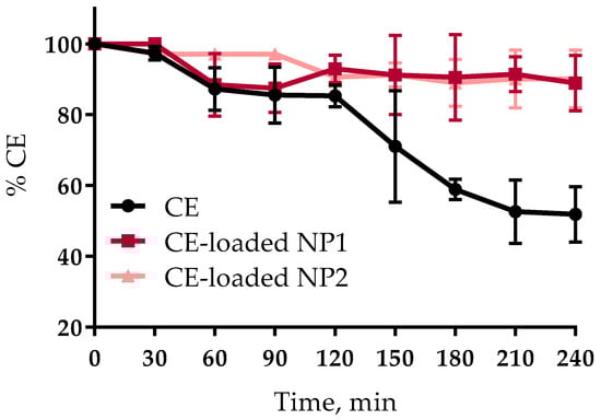 The stability plots of CE, either free or encapsulated in NPs, in simulated gastric fluids (SGFs), are reported in Figure 1. Both NP types were able to protect the CE from degradation for at least 4 h, in fact, the encapsulated CE stability was around 90%, i.e., two-fold higher than that of the free CE. The results point out much more stability of CE encapsulated in either NP type in comparison with the plain CE. At the end of the stability study, NP1 and NP2 were checked for size. Both showed a slight size increase (NP1, 394.4 ± 8.8 nm; NP2, 379.9 ± 9.9 nm) not so marked as to exceed the upper size limit reported by Norris et al. [39] for the particles able to cross the intestinal barrier (500 nm). This data demonstrate that the CE encapsulation into NPs protects them from oxidation, thus preserving their therapeutic potential.