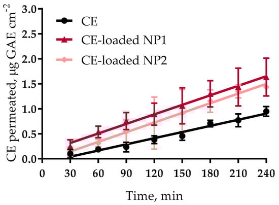 CE apparent permeation plots across excised rat intestine. CE = cherry extract; NP1 = NPs based on quaternary ammonium chitosan; NP2 = NPs based on quaternary ammonium S-protected thiolated chitosan; GAE = gallic acid equivalent.