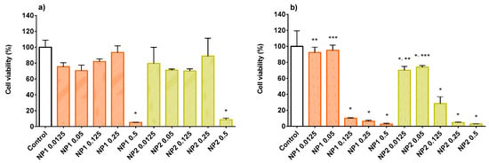 Human umbilical vein endothelial cell (HUVEC) viability after 2 h (a) or 24 h (b) of incubation with empty NP1 or NP2 (0.0125 to 0.5 mg/mL) in culture medium. Data are expressed as % viable cells compared to 100% of control (untreated cells). *, significantly different from control; **, ***, significantly different from each other.