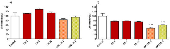 HUVEC viability after 2 h (a) or 24 h (b) of incubation with free CE (2, 5, 10 µg/mL GAE) and CE-loaded NP1 or NP2 (CE concentration, 2 µg/mL GAE) in culture medium. Data are expressed as % viable cells compared to 100% of control (untreated cells). *, significantly different from control; **, significantly different from each other.