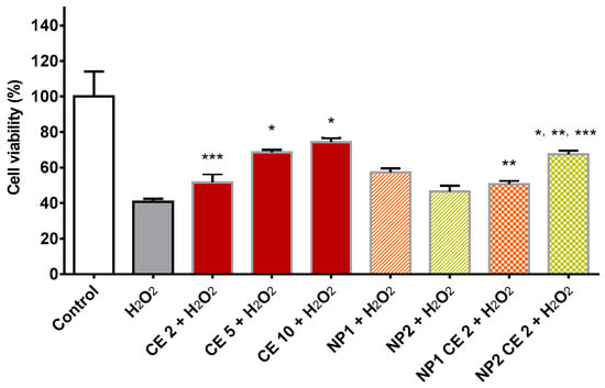 HUVEC viability after 2 h of pre-treatment with free CE (2, 5, 10 µg/mL GAE), empty NP1 or NP2, or CE-loaded NP1 or NP2 (CE concentration 2 µg/mL GAE), and the subsequent treatment with 50 μM H2O2 for 1 h. Data are expressed as % viable cells compared to negative control (H2O2). *, significantly different from H2O2; two means at comparison are indicated by the same mark (** or ***) if their difference is significant.