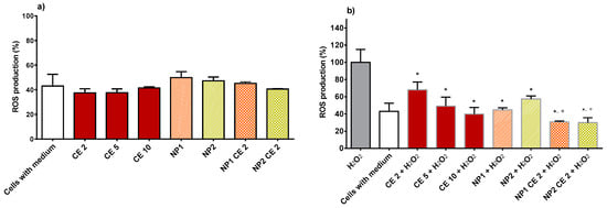 (a) shows reactive oxygen species (ROS) production in HUVECs treated with free CE (2, 5, 10 µg/mL GAE), empty NP1 or NP2, or CE-loaded NP1 or NP2 (CE concentration 2 µg/mL GAE) for 2 h. (b) represents ROS production after 2 h of pre-treatment with free CE (2, 5, 10 µg/mL GAE), empty NP1 or NP2, or CE-loaded NP1 or NP2 (CE concentration 2 µg/mL GAE) and subsequent treatment with 50 μM H2O2 for 1 h. Data are expressed as % ROS production compared to 100% (cell treated with H2O2). * Significantly different from H2O2; ° significantly different from CE 2 + H2O2.