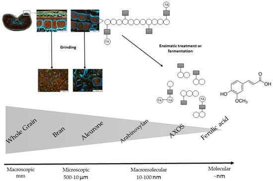 From macro to molecular levels, the most nutritionally interesting technological fractions of wheat bran and aleurone layer, as well as arabinoxylan and ferulic acid components (adapted from Reference [43]).