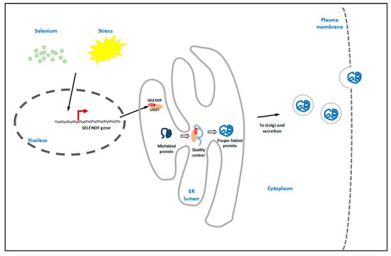 As shown in the concluding Figure 1, as an ER selenoprotein, SELENOF can be regulated by both selenium status and ER stress. SELENOF forms a complex with UGGT and is involved in glycoprotein folding quality control. The newly synthesized and folded proteins are packed into vesicles, followed by Golgi transportation and secretion.