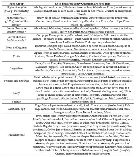 The study was designed to validate the EAT5 FFQ for measuring intake of nutrients (energy, carbohydrate, fiber, total NSP, soluble NSP, and insoluble NSP) and food groups (e.g., ‘Higher fiber more healthy cereals’, ‘Higher fiber less healthy cereals’, ‘Lower fiber more healthy cereals’, ‘Lower fiber less healthy cereals’, ‘Nuts and legumes’, ‘Fruits’, ’Vegetables’, ‘Potatoes and hot chips’, ‘Yoghurt’). Parent and child participants attended two appointments four weeks apart. At the first appointment, the EAT5 FFQ and socio-demographic questionnaire were completed by the parents, and anthropometric measurements of the child were obtained. A 3-day WDR was completed over the following four weeks. At the second appointment, the EAT5 FFQ was administered again so that reproducibility could be assessed. The FFQs asked about intake in the past month.