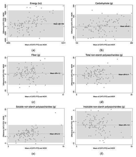 Bland-Altman plots for nutrient intakes from a randomly chosen FFQ1 or FFQ2 EAT5 FFQ (‘fruit and vegetable adjusted’) and the weighed diet record (WDR): (a) Energy in kJ; (b) Carbohydrate in grams; (c) Fiber in grams; (d) Total non-starch polysaccharides in grams; (e) Soluble non-starch polysaccharides in grams; and (f) Insoluble non-starch polysaccharides in grams.