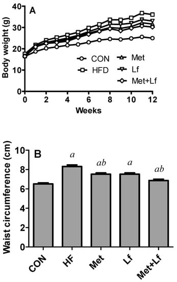 Four-week-old male C57BL/6 mice were obtained from Shanghai Laboratory Animal Company (Shanghai China) and housed under 12 h/12 h light/dark cycle at a constant temperature of 22 ± 2 °C and 60% humidity. After one week of acclimatization, 64 animals were randomly divided into five groups: (1) control group (CON, n = 8), (2) HFD group (n = 14), (3) HFD plus Met (Met, n = 14), (4) HFD plus Lf (Lf, n = 14), and (5) HFD plus Met and Lf with the same dosage applied to aforementioned two groups (Met + Lf, n = 14). Control diet (10% calories from fat, D12450J) and HFD (60% calories from fat, D12492) were purchased from Research Diets Inc. (New Brunswick, NJ, USA). Met was obtained from Tokyo Chemical Industry Co., Ltd. (Tokyo, Japan). Lf was obtained from Hilmar Cheese Company (Hilmare, CA, USA). According to the literature, Met and Lf were set at 200 mg/kg body weight and 2 g/100 mL, respectively [,]. Both were dissolved in distilled water and the drinking water was changed every two days. The animals had access to water and diets at all the times. The experiment lasted for 12 weeks. All the procedures were performed in accordance with the Guidelines in the Care and Use of Animals and with the approval of Soochow University Animal Welfare Committee.