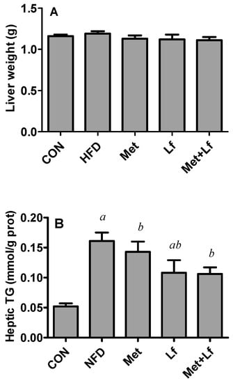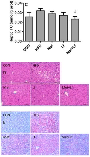 Effect of Met and Lf on hepatic lipid accumulation. (A) Liver weight; (B) hepatic TG; (C) hepatic TC; (D) liver tissues stained with HE (200×); and (E) Oil Red O (400×). Values are express as mean ± SE. a p < 0.05 from CON group; b p < 0.05 from HFD group.