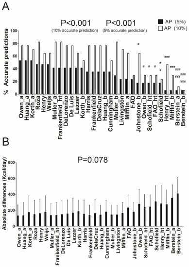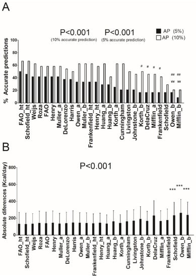 Percentage of accurate prediction of resting energy predictive equations and mean differences between predicted and measured resting energy expenditure in absolute values in normal-weight individuals. (A) Percentage of prediction accuracy at 5% and 10% of resting energy expenditure. (B) Mean (SD) differences between predicted and measured resting energy expenditure in absolute values; p value of repeated measures analysis of variance (with Bonferroni post-hoc analysis) among the predictive equations; * = p < 0.05; ** = p < 0.01; *** = p < 0.001 when compared with the predictive equation that presented the least absolute differences with respect to the measured resting energy expenditure (FAO_ht); ¥ = p < 0.05; ¥¥ = p < 0.01; ¥¥¥ = p < 0.001 when compared with the predictive equation that presented the best resting energy expenditure prediction accuracy (10%) with respect to the measured resting energy expenditure (FAO_ht); # = p < 0.05; ## = p < 0.01; ### = p < 0.001 when compared with the predictive equation that presented the best resting energy expenditure prediction accuracy (5%) with respect to the measured resting energy expenditure (FAO_ht). AP: Accurate prediction; “_a” refers to predictive equations which require only anthropometric parameters to calculate REE, “_b” refers to predictive equations which require body composition parameters to calculate REE, and “_ht” refers to predictive equations which are proposed by the same author and include height.