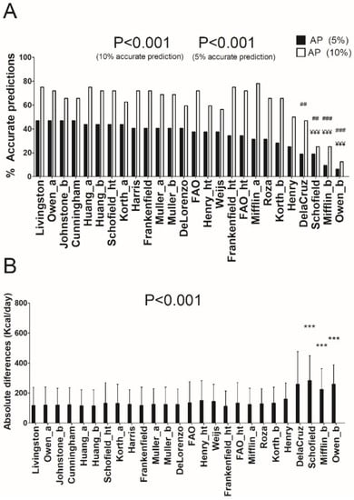 Percentage of accurate prediction of resting energy predictive equations and mean differences between predicted and measured resting energy expenditure in absolute values in overweight individuals. (A) Percentage of prediction accuracy at 5% and 10% of resting energy expenditure. (B) Mean (SD) differences between predicted and measured resting energy expenditure in absolute values; p value of repeated measures analysis of variance (with Bonferroni post-hoc analysis) among the predictive equations; * = p < 0.05; ** = p < 0.01; *** = p < 0.001 when compared with the predictive equation that presented the least absolute differences with respect to the measured resting energy expenditure (Livingston); ¥ = p < 0.05; ¥¥ = p < 0.01; ¥¥¥ = p < 0.001 when compared with the predictive equation that presented the best resting energy expenditure prediction accuracy (10%) with respect to the measured resting energy expenditure (Roza); # = p < 0.05; ## = p < 0.01; ### = p < 0.001 when compared with the predictive equation that presented the best resting energy expenditure prediction accuracy (5%) with respect to the measured resting energy expenditure (Livingston). AP: Accurate prediction; “_a” refers to predictive equations which require only anthropometric parameters to calculate REE, “_b” refers to predictive equations which require body composition parameters to calculate REE, and “_ht” refers to predictive equations which are proposed by the same author and include height.
