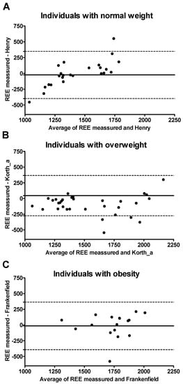 Figure 4 shows Bland–Altman plots for the three selected REE predictive equations and measured REE by weight status. The limits of agreement were the following: (i) −496 to 373 Kcal/day in normal-weight participants (using the equation of FAO/WHO/UNU [13], see Figure 4A and Supplementary Table S2A), (ii) −249 to 562 Kcal/day in overweight participants (using the equation of Livingston [11], see Figure 4B and Supplementary Table S2B), and (iii) −591 to 245 Kcal/day in individuals with obesity (using the equation of Owen [8,9,11], see Figure 4C and Supplementary Table S2C).