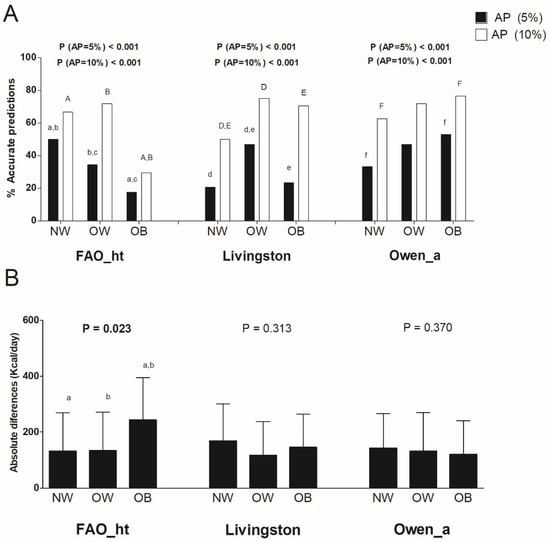 Percentage of accurate prediction of the most accurate predictive equations and mean differences between predicted and measured resting energy expenditure in absolute values by weight status. (A) Percentage of prediction accuracy at 5% and 10% of resting energy expenditure. (B) Mean (SD) differences between predicted and measured resting energy expenditure in absolute values; p value of an analysis of variance (with Bonferroni post-hoc analysis) across weight status. Similar letters (i.e., a-a, b-b) indicate significant differences (p < 0.05) considering Bonferroni post-hoc analysis. AP: Accurate prediction; “_a” refers to predictive equations which require only anthropometric parameters to calculate REE, and “_ht” refers to predictive equations which are proposed by the same author and include height.