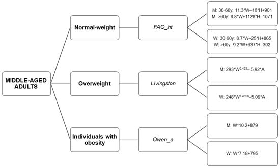 Decision tree to select a REE predictive equation by weight status. “_a” refers to predictive equations which require only anthropometric parameters to calculate REE, and “_ht” refers to predictive equations which are proposed by the same author and include height. Abbreviations: M: Men; W: Women; W: Weight; H: Height; A: Age; y: years.