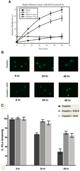 Next, we assessed the ability of EGCG and GCG to inhibit repair of cisplatin-induced interstrand crosslinks in human cancer cells via a modified alkaline comet assay. Because ERCC1/XPF endonuclease activity is critical for repair of DNA interstrand crosslinks, we chose to assess the ability of these compounds to inhibit repair of these DNA lesions. Furthermore, the modified alkaline comet assay is an established method to indirectly monitor interstrand crosslink repair over time in cells. H460 lung cancer cells were treated with 15 μM EGCG or GCG for 2 h, after which an IC90 concentration of cisplatin was added for an additional 2 h followed by drug removal and replacement with complete medium. Just following the experimental treatment and time-course, cells were treated with 100 μM H2O2 to induce random DNA double strand breaks, a critical component of the assay to be able to distinguish ICL containing from repaired DNA segments during denaturing electrophoresis. Immediately after initial treatment, single cell electrophoresis and staining of the DNA was performed and the level of interstrand crosslinking was determined and normalized to 100% interstrand crosslinks remaining for each treatment group (Figure 2B,C). Then, 24 h post-treatment, we observed a decrease in the amount of ICLs remaining as evident by the increased tail length over time, as observed in the comet assay images which were indicative of increased ICL repair over time (Figure 2B,C). Persistence of ICLs in this assay resulted in a maintenance of shorter tail length as the crosslink retarded the DNA mobility. This trend continued into the 48 h time point (Figure 2B,C). On the other hand, treatment with EGCG or GCG led to decreased repair of DNA ICLs over time which was observed starting at the 24 h time point and continuing into the 48 h time point (Figure 2B,C). Together these data indicate that EGCG is a potentially partially reversible inhibitor of ERCC1/XPF and GCG is a reversible inhibitor of ERCC1/XPF activity; however, both compounds are capable of inhibiting ICL DNA repair in vitro.