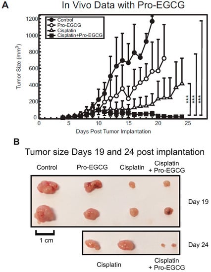 (A) Plot representing tumor growth of untreated, cisplatin-treated, Pro-EGCG-treated, or combination-treated mice. Data represented as tumor size (mm3) over time. (B) Images of tumors harvested from sacrificed mice at day 19 and day 24. Growth curves were compared using a linear-mixed effects model with mice-specific effect as a random variable. P values were adjusted using Bonferroni correction. *** p < 0.001.