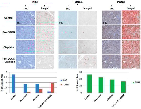 Raw images, ImageJ-processed images (Top), and quantification of immunohistochemical analysis of Ki67, TUNEL, and PCNA staining in tumors harvested from sacrificed mice (Bottom). Data showing increased TUNEL staining, decreased Ki67 staining, and decreased PCNA staining in the cisplatin+Pro-EGCG-treated tumors compared to other groups.