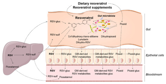 Overview of the metabolism of resveratrol and the impact of gut microbiota. Upon intake, RSV and RSV precursors enter the gut and are partly metabolised by gut microbiota to produce particular RSV derivatives and RSV. Free RSV, RSV precursors and microbiota-derived RSV metabolites are conjugated in the intestine and liver, from where conjugated forms can return to the intestine. In the liver, RSV is metabolised to piceatannol, which can be released into the bloodstream, and delivered to target tissues together with RSV, RSV precursors, microbiota-derived RSV metabolites and their respective conjugate forms. RSV, resveratrol; gluc, glucuronides; sulf, sulfates.