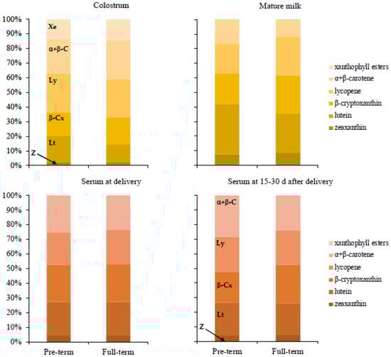 Percentage distribution of the individual carotenoids and xanthophyll esters in colostrum and mature milk samples, and in serum collected at delivery or at 15–30 days after delivery, from preterm and full-term mothers. Xe: xanthophyll esters; α+β-C: α+β-carotene; Ly: lycopene; β-Cx: β-cryptoxanthin; Lt: lutein; Z: zeaxanthin.