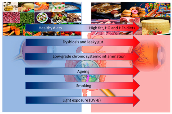 Altered dietary habits, dysbiosis and leaky gut, and low grade inflammation, together with aging, smoking and light exposure may influence the risk and progression of age-related macular degeneration (AMD). Abbreviations: HG: High Glucose; HFr: High Fructose; UV-B: Ultraviolet-B.