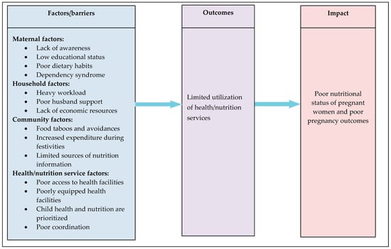 Maternal factors (such as lack of awareness, low educational status, poor dietary habits, dependency syndrome); household factors (such as heavy workload, poor husband support, lack of economic resources); community factors (such as food taboos and avoidances, increased expenditure for cultural and religious festivities, limited sources of nutrition information); and health/nutrition service factors (such as poor access to health facilities, poorly equipped health facilities, focus on child health and nutrition, poor coordination among nutrition-specific and sensitive sectors) were identified as the demand and supply barriers that limit the uptake of nutrition services during pregnancy.