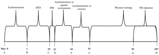Flowchart of the experimental design. A—Acclimatization phase. B—High fat diet induction for diabetic animals and commercial feeding by nondiabetic rats. C—Injection of streptozotocin (35 mg/kg) for diabetic groups. D—Confirmation of diabetes induction (glycaemia greater than 200 mg/dL) and acclimatization to the aquatic environment for trained groups. E—Acclimatization to exercise. F—Physical training. G—Periodontal disease induction (ligature around lower jaw first molars). H—End of experiment. Euthanasia and tissue collection. HFD—High fat diet. DM—Diabetes Mellitus. PD—Periodontal disease.