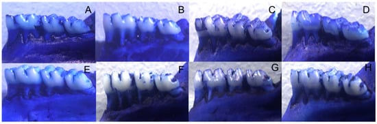 We submerged and defleshed the right side of the jaws in hydrogen peroxide for 24 h. This was followed by the cleaning, drying and staining of the specimens with 1% blue methylene []. Alveolar bone loss was evaluated in digital images obtained through stereomicroscopy (Leica M205A; Leica Microsystems, Wetzlar, Germany). We performed linear measurements of the distance between the cemento-enamel junction and the bone crest of each vestibular root face using Image J software (Bethesda, MD, USA) by a blind experienced examiner []. Alveolar Bone Loss (ABL) was determined by the mean of the three roots measurements.