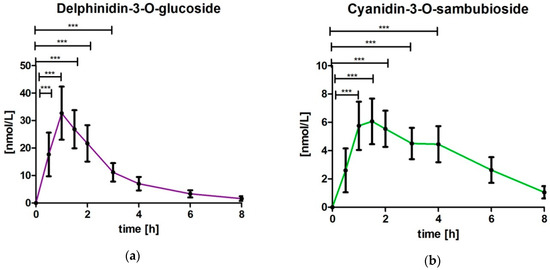 Delphinidin-3-O-glucoside and cyanidin-3-O-sambubioside concentration time profile after intake of maqui berry extract depicted as a summary curve of mean values at single time points (mean ± 95% CI, *** p ≤ 0.001): (a) delphinidin-3-O-glucoside (b) cyanidin-3-O-sambubioside.