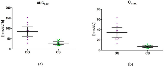 Scatter chart with pharmacokinetic endpoints calculated from individual concentration time curves after intake of maqui berry extract; mean ± 95% CI: (a) AUC0–8 h [nmol/L*h] (b) Cmax [nmol/L]; DG: delphinidin-3-O-glucoside; CS: cyanidin-3-O-sambubioside.