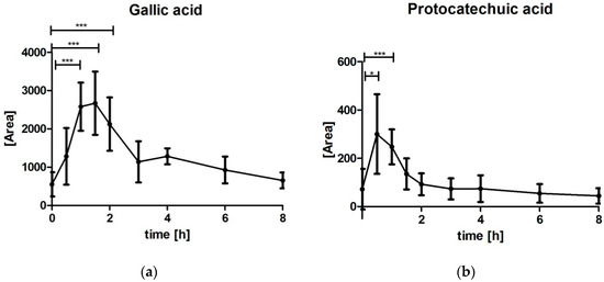 Gallic acid and protocatechuic acid concentration time profiles after intake of maqui berry extract presented as summary curves of mean values of area units at single time points (mean ± 95% CI, * p < 0.05; *** p ≤ 0.001): (a) Gallic acid [area units] (N = 8 due to exclusion of outliers) (b) Protocatechuic acid [area units] (N = 12).