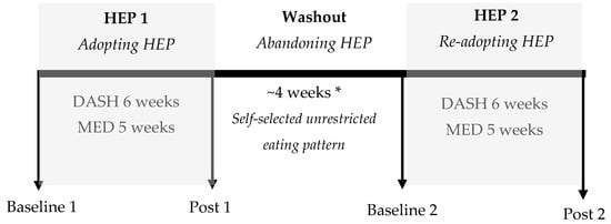 Study schematic of assessing effects of healthy eating pattern cycling on cardiovascular disease risk factors. Cardiovascular disease risk factors were measured at baseline 1, post 1, baseline 2, and post 2. Participants consumed self-selected foods during baseline 1, throughout the washout period, and during baseline 2. Participants consumed prescribed healthy eating patterns during post 1 and post 2. HEP, healthy eating pattern; DASH, Dietary Approaches to Stop Hypertension-style eating pattern; MED, Mediterranean-style eating pattern; * median = 28 days.