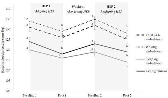 Systolic blood pressure changes during healthy eating pattern cycling. Results are presented as LS mean ± SEM of LS mean, n = 60. HEP; healthy eating pattern. Subjects consumed self-selected foods during baseline 1, throughout the washout (abandoning) period, and during baseline 2. Subjects consumed prescribed healthy eating patterns during post 1 and post 2. Different letter superscripts represent different values (p < 0.05). Results for diastolic blood pressures followed a similar pattern; see Table S1.