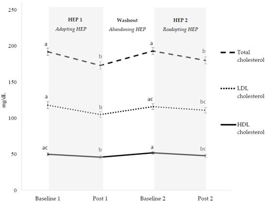 Blood lipid and lipoprotein changes during healthy eating pattern cycling. Results are presented as LS mean ± SEM of LS mean, n = 60. HEP; healthy eating pattern. Subjects consumed self-selected foods during baseline 1, throughout the washout (abandoning) period, and during baseline 2. Subjects consumed healthy eating patterns during post 1 and post 2. Different letter superscripts represent different values (p < 0.05). Conversion to mmol/L for total, LDL, and HDL cholesterol: multiply mg/dL by 0.0259.