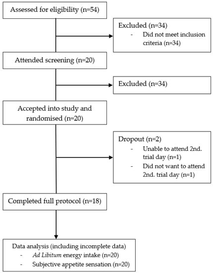 Sample size for appetite sensations were based on the study by Flint et al. (2000). According to this study, an effect size of 5% for mean value rankings of the primary endpoint, satiety, and secondary endpoints; hunger, fullness, and prospective food consumption, can be detected when including 18 subjects and using a paired study design (α = 0.05, β = 0.80) []. To reach statistical power of 0.8 in the secondary endpoint, ad libitum energy intake, approximately 26 subjects would be needed, depending on effect size [].