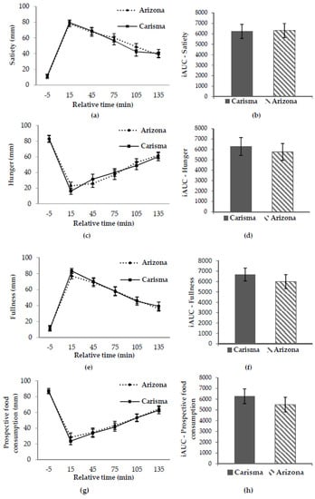 Unadjusted mean curves for satiety (a), hunger (c), fullness (e) and prospective food consumption (g) and corresponding incremental areas under/over the curves (iAUC/iAOC) (b), (d), (f) and (h). Data are shown as means ± SE. All p > 0.05 (adjusted p-value). Carisma® (low GI) and Arizona (high GI). SE, standard error; GI, glycaemic index.
