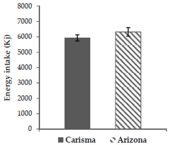 Unadjusted means for ad libitum energy intake ± SE. p = 0.105 (adjusted p-value). Carisma® (low GI) and Arizona (high GI). SE, standard error; GI, glycaemic index.