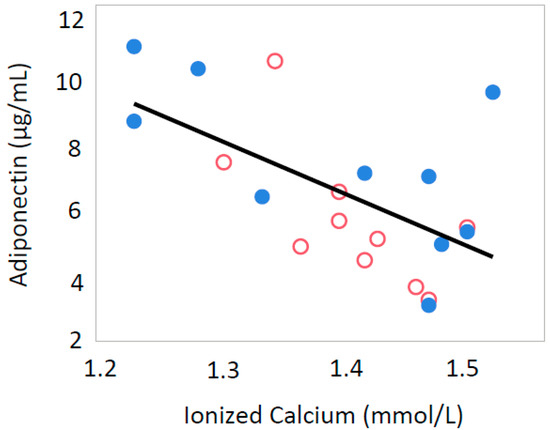 Relationship between ionized calcium and serum adiponectin levels in all male rat offspring (R = −0.605, p = 0.0037). Open circle, male offspring from control group; closed circle, male offspring from Ca-deficient group.