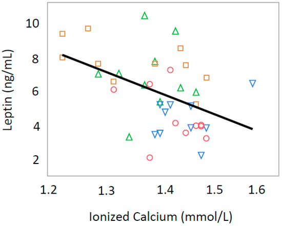 Relationship between serum ionized calcium and serum leptin levels in both male and female rat offspring (R = −0.454, p = 0.0025). Green triangle, male offspring from control group; square, male offspring from Ca-deficient group; circle, female offspring from control group; blue inverse triangle, female offspring from Ca-deficient group.