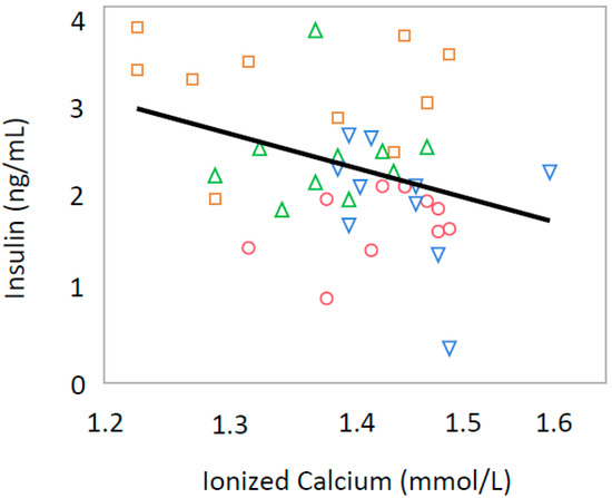 Relationship between serum ionized calcium and serum insulin levels in both male and female rat offspring (R = −0.370, p = 0.0270). Green triangle, male offspring from control group; square, male offspring from Ca-deficient group; circle, female offspring from control group; blue inverse triangle, female offspring from Ca-deficient group.