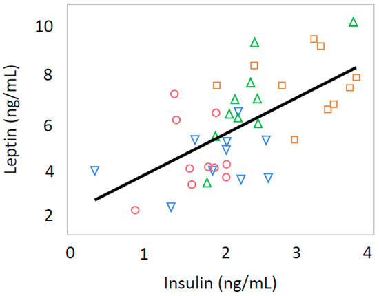 Relationship between serum leptin levels and serum insulin levels in both male and female rat offspring (R = 0.627, p < 0.0001). Green triangle, male offspring from control group; square, male offspring from Ca-deficient group; circle, female offspring from control group; blue inverse triangle, female offspring from Ca-deficient group.