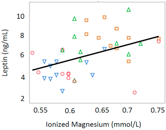 Relationship between serum leptin levels and serum ionized magnesium in both male and female rat offspring (R = 0.436, p = 0.0039). Green triangle, male offspring from control group; square, male offspring from Ca-deficient group; circle, female offspring from control group; blue inverse triangle, female offspring from Ca-deficient group.