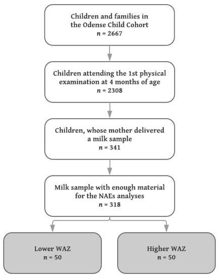 Milk samples from mothers to singleton infants with the lowest (n = 50) and highest (n = 50) WAZ were included, median (IQR) WAZ −0.67 (−0.98, −0.54) and 1.52 (1.31, 1.84), respectively. Since no a priori data concerning differences in the levels of NAE lipids in human milk exist, a power calculation was not performed, but the sample size chosen was considered sufficient to detect robust changes of biological (as opposed to purely statistical) significance. A flowchart of the inclusion is shown in Figure 1.