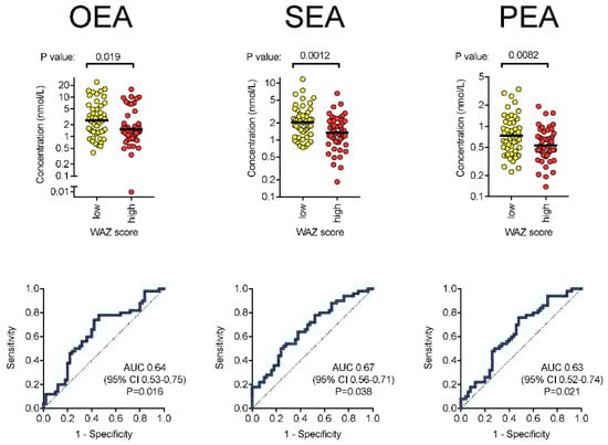 The individual values for OEA, SEA, and PEA are shown in the top row graphs in Figure 2. The upper panels show scatter plots (on a log10 scale) for the low and high WAZ groups (both n = 50), with the mean of the logged values being indicated by the bars. p-values are for Welch’s two-sample t-tests. The lower panels show the ROC analyses for each lipid with area under the curve (AUC), 95% CI, and p-values being given in each graph. There is a possible outlier for OEA, but the P-value remained significant (0.035, Welch’s two-sample t-test) upon removal of this outlier. The critical value of p at a false discovery rate of 5% was 0.05.