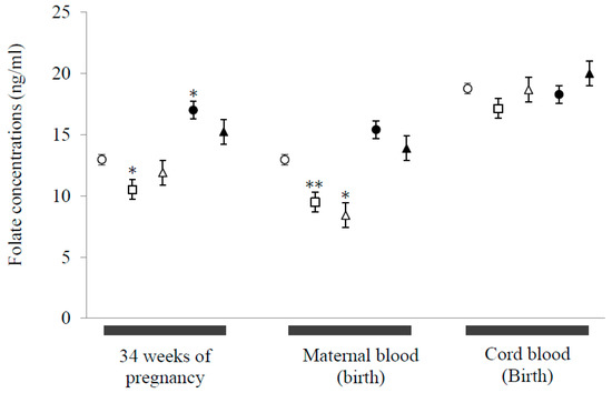 Folate is an essential cofactor in metabolic pathways that influence DNA methylation patterns, DNA synthesis and cell proliferation [1,2]. It is crucial to the 1-carbon cycle where it acts as a transporter of CH3 and the single carbon donor in one carbon metabolism [3]. Limited dietary availability can contribute to abnormal DNA methylation patterns in mice [4] and, thus, potentially to developmental programming [5]. Fortification of the diet with folic acid has been adopted by many countries to ensure that dietary intake is rarely limited, particularly during pregnancy, in order to prevent neural tube defects when folate requirements can increase because of increased rates of cell division and growth, especially during embryo development [6,7]. Indeed, it is now recommended that, during pregnancy, there should be no upper limit on dietary intake [8]. Pregnant women with high body mass index (BMI) and gestational diabetes (GD) can have inadequate dietary intakes of folate [9,10,11] and lower folate concentrations [12,13]. This could contribute to some of the adverse neonatal outcomes associated with maternal obesity [14], including greater risks of preterm deliveries, neural tube defects and low birth weight [15,16,17].