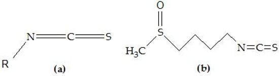 Chemical structures of (a) isothiocyanates (ITCs) and (b) sulforaphane (SFN).