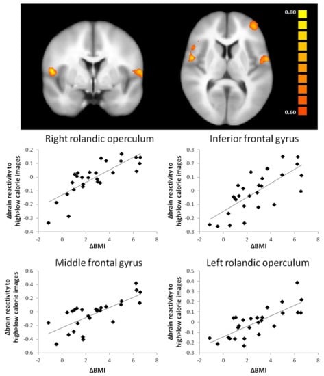 As expected, participants significantly reduced their body weight and fat mass during the intervention period. Changes in BMI were positively related to changes in brain reactivity to high-calorie compared to low-calorie images in the rolandic operculum, inferior frontal gyrus and middle frontal gyrus. Especially the inferior frontal gyrus and middle frontal gyrus have been implicated in dietary self-control [,]. The association with reactivity to high-calorie images versus low-calorie images is in line with studies reporting that activation in these regions modulates value-encoding regions when participants choose healthy over unhealthy foods []. A positive relationship between brain response to food versus non-food cues in the anterior cingulate and BMI was also found in a study by Martens et al. []. Furthermore, weight loss using a 6-month lifestyle intervention in overweight/obese individuals has previously shown to reduce brain activation to high-calorie images and cause a shift in relative activation favouring low-calorie versus high-calorie food cues in the putamen []. Weight loss after bariatric surgery was shown to support reduced neuronal responses to food cues in multiple food reward regions [,]. In our study, changes in body fat percentage were positively related to changes in brain activation contrasting high-calorie with low-calorie images in various gustatory and frontal control regions, including the putamen and insula. This may be interesting in terms of linking eating behaviour and body-fat mass []. Higher cue reactivity in the putamen and insula has been associated with food cravings and may be a mechanism to match higher energy needs with increased adiposity [,]. Our findings are in line with a study that reported a positive association between brain activation to high-calorie food cues and abdominal fat in girls, independent of BMI []. Suggested mechanisms through which fat mass may influence brain reward signalling are increased leptin concentrations or increased low-grade inflammation. Prior research reported a positive association between leptin concentrations and brain responses to high-calorie food versus non-food cues in the putamen/caudate, insula and amygdala in lean and obese individuals [,]. Leptin injections were able to reduce weight loss-induced effects on neural activity to visual food cues in brain areas associated with regulatory, emotional and cognitive control of food intake []. Adiposity-related inflammation has been suggested as another mechanism via which increased fat mass may moderate brain reward. Increased inflammation was shown to be related to reduced integrity and lower functional connectivity in food reward-related brain areas [] but also to decreases in dopamine availability and release, leading to alterations in motivation and reward []. Changes in body-fat percentage were positively associated with changes in reactivity to high-calorie images versus low calorie-images in the putamen and insula.