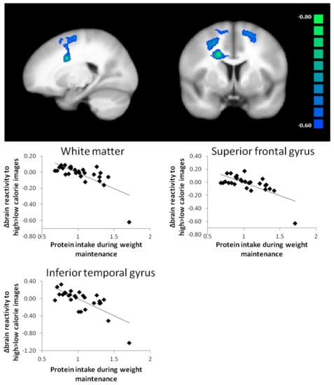 Therefore, we applied post-hoc analyses on the whole group of participants to assess effects of protein intake on brain reactivity to food cues. Protein intake during the weight maintenance period in the whole group was negatively related to changes in brain activation contrasting high-calorie with low-calorie images in regions associated with frontal control (the superior frontal gyrus) and visual processing (the left inferior temporal gyrus). This is in line with evidence coming from short-term studies [,]. A high-protein breakfast was shown to further reduce hippocampal and parahippocampal reactivity to food cues compared to a normal-protein breakfast, measured in 20 overweight/obese girls in a randomized crossover study []. Moreover, in 23 healthy women a 12-day low-protein diet compared to a high-protein diet led to an increased BOLD response in the orbitofrontal cortex and striatum in response to food cues []. Based on our data, it is not possible to determine the causality of the relation between protein intake and brain reactivity to food cues but multiple explanations have been postulated. Protein intake may influence brain signalling via changes in the neurotransmitter precursor availability. The amino acid tryptophan is the precursor for serotonin and tyrosine and phenylalanine are precursors for dopamine []. Ingestion of protein increases the availability of these precursors, potentially resulting in higher neurotransmitter synthesis [,]. Furthermore, protein was shown to modulate food reward via activation of the vagus nerve, which projects to the nucleus tractus solitaries in the brain stem to relay satiety signals to the brain. Glutamate has shown to activate branches of the vagus nerve [] and ingestion of glutamate led to activation of the amygdala, hippocampus and lateral hypothalamus in rats [] while activation was fully suppressed after vagotomy. Indirectly, amino acids could also influence brain reward signalling through an increased release of anorectic hormones from the gut []. It needs to be mentioned however, that in our particular study, the effects expected to be due to increased protein intake, could also be related to decreased carbohydrate or fat intake during the intervention []. Increased protein intake during the dietary intervention may be part of a general change of a healthier lifestyle and other factors advocated in the PREVIEW intervention guidelines aiming at a generally healthier lifestyle could contribute to the results.