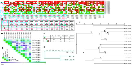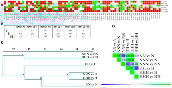 The second major cluster, β, was subdivided into δ and ε (Figure 4C). While δ showed sets of comparisons uncovering the impact of single and chronic HG stimulus versus NG, ε grouped these showing the influence of a chronic versus a double HG hit. Regarding δ, we observed the predominance of downregulated miRNAs, which was the most pronounced for HHH vs. NNN (Figure 5A,B). Interestingly, the sub cluster of δ, ι, revealed a similarity between the miRNAs profiles of HHH vs. NNN and NHN vs. NNN, which was not reflected in correlation analysis, yet could be easily inferred from Figure 5B. Moreover, we observed several moderate correlation coefficients confirming the similarity among all of the comparisons involving only a single stimulus of HG versus chronic NG (Figure 4D). These results suggest that even a single exposure to HG during ADG might exert miRNAs expression changes that are similar to those found in Ads exposed chronically to HG.