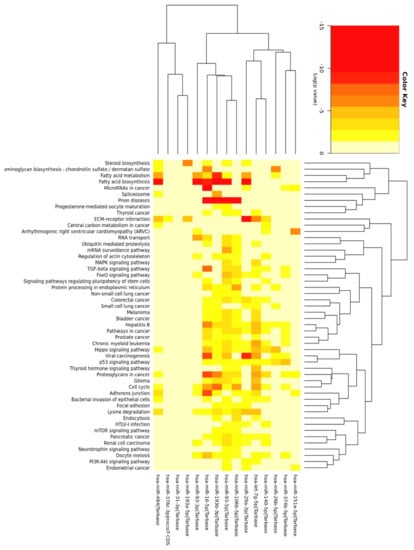 The heat map of results generated by DIANA-miRPath v3.0 and merged by pathways’ union for 15 core miRNAs (significance clusters). Full name of the second record is “Glycosaminoglycan biosynthesis: chondroitin sulfate / dermatan sulfate”.