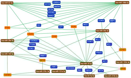 Network of interactions between several core miRNAs and their validated target genes provided by miRTargetLink Human. Orange describes genes interacting with at least three miRNAs, while blue shows genes targeted by two miRNAs.